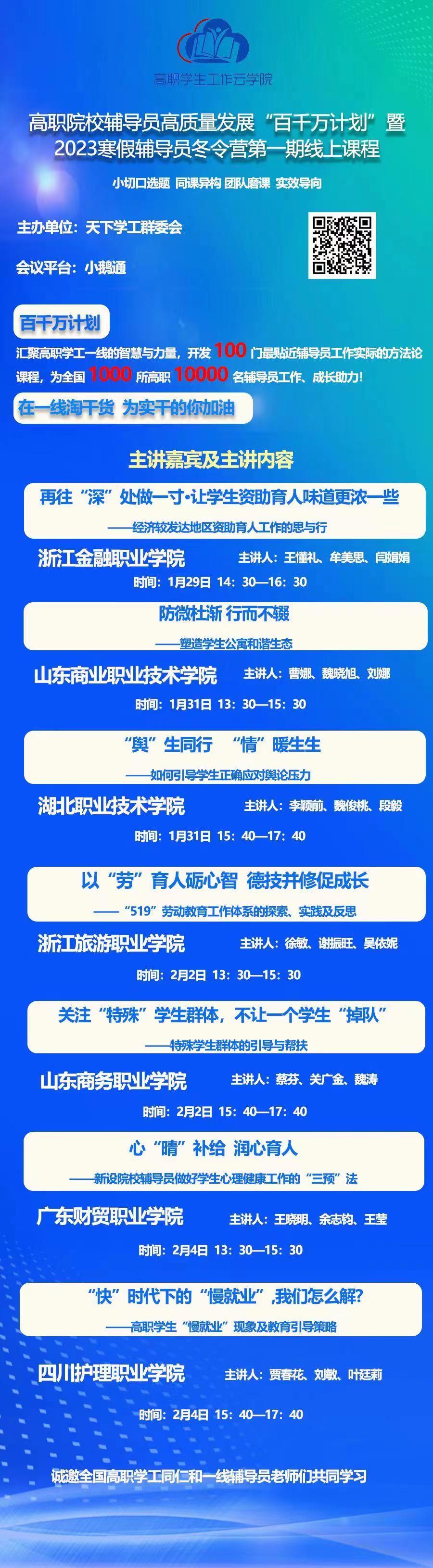 全国高职院校辅导员高质量发展“百千万计划”汇聚了全国高职院校学工一线的智慧与力量,开发100门最贴近辅导员工作实际的方法论课程,为全国1000所高职10000名辅导员工作、成长助力,目前已纳入学院2023年辅导员培训计划。今年,学院将以促进辅导员专业化、职业化和可持续发展为导向,以构建完善的培训体系为基础,以提高培训能力为重点,以创新培训方式为手段,以提高培训质量为目标,从整体上提升辅导员队伍的工作水平,达到赋能的培训目的,努力造就一支政治强、业务精、纪律严、作风正的高水平辅导员队伍。