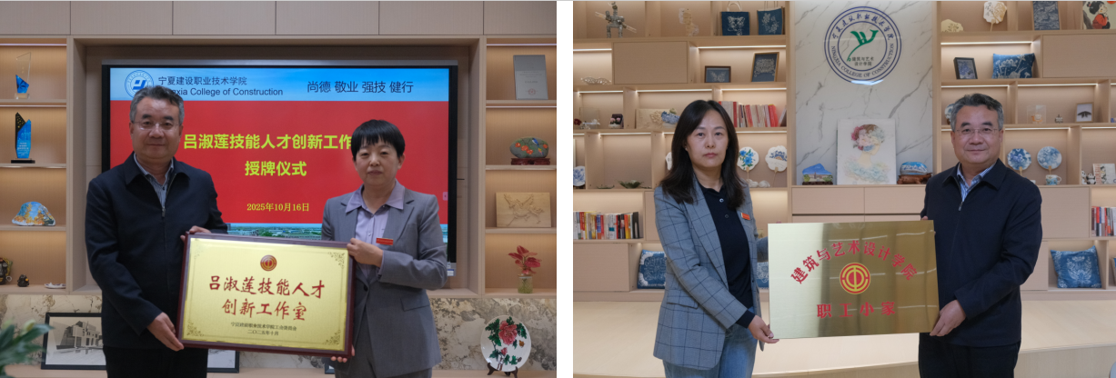 仪式上,相关负责人详细介绍了“吕淑莲技能人才创新工作室”“职工小家”的建设背景、阶段性成果及未来发展规划等。李润安为“吕淑莲技能人才创新工作室”与建筑与艺术设计学院“职工小家”授牌。